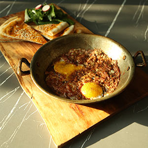 قرمه گوسفندی100گرم،سه عدد تخم مرغ،دورچین سبزی،نان مخصوص،به همراه یک فنجان چای