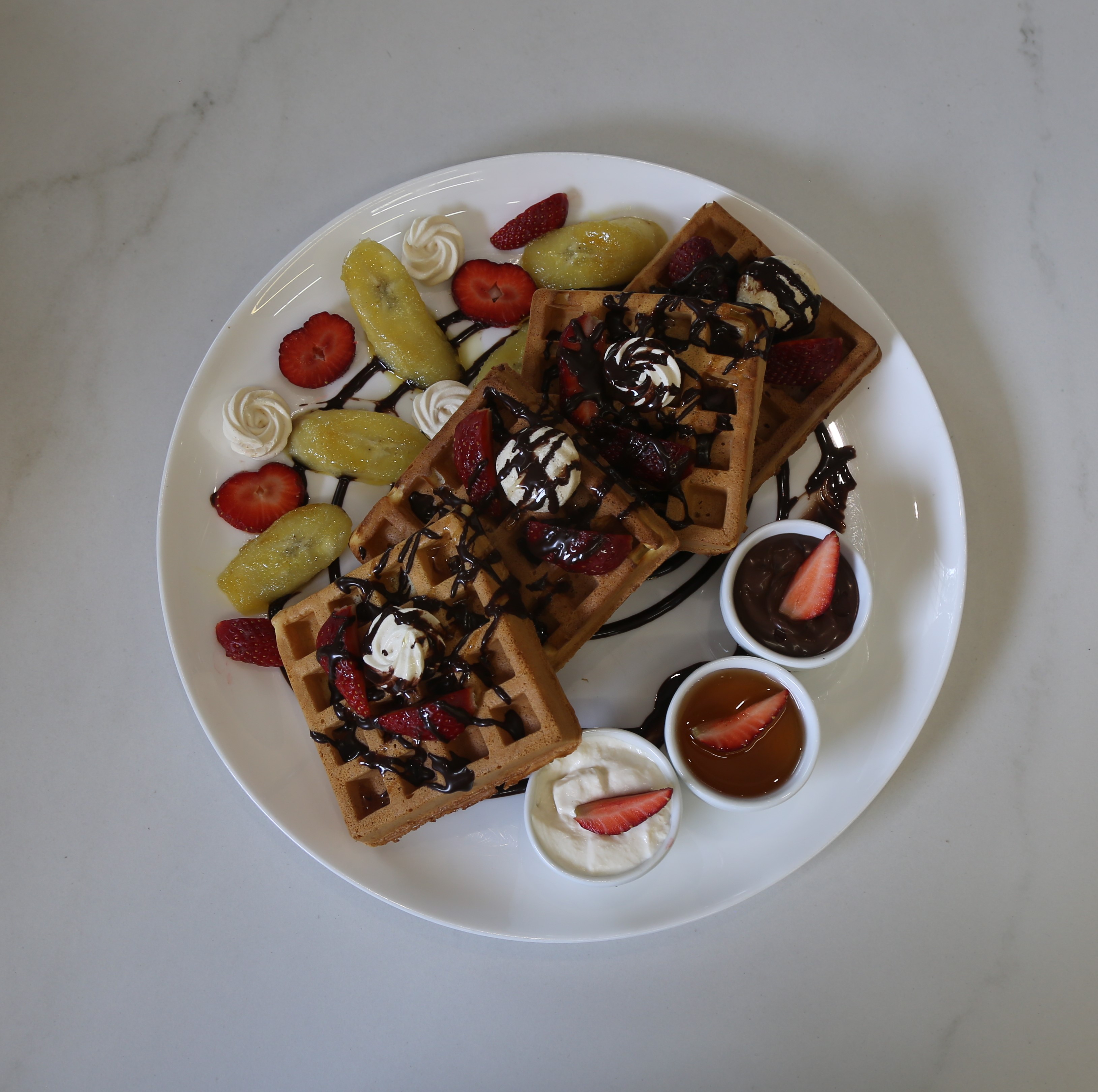 چهارورق وافل،توت فرنگی،موزکاراملی،نوتلا20گرم،خامه30گرم ،عسل30گرم،یک فنجان چای