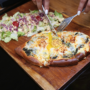 نان مخصوص خاچاپوری، یک عدد تخم مرغ ، قارچ، اسفناج، به همراه یک فنجان چای