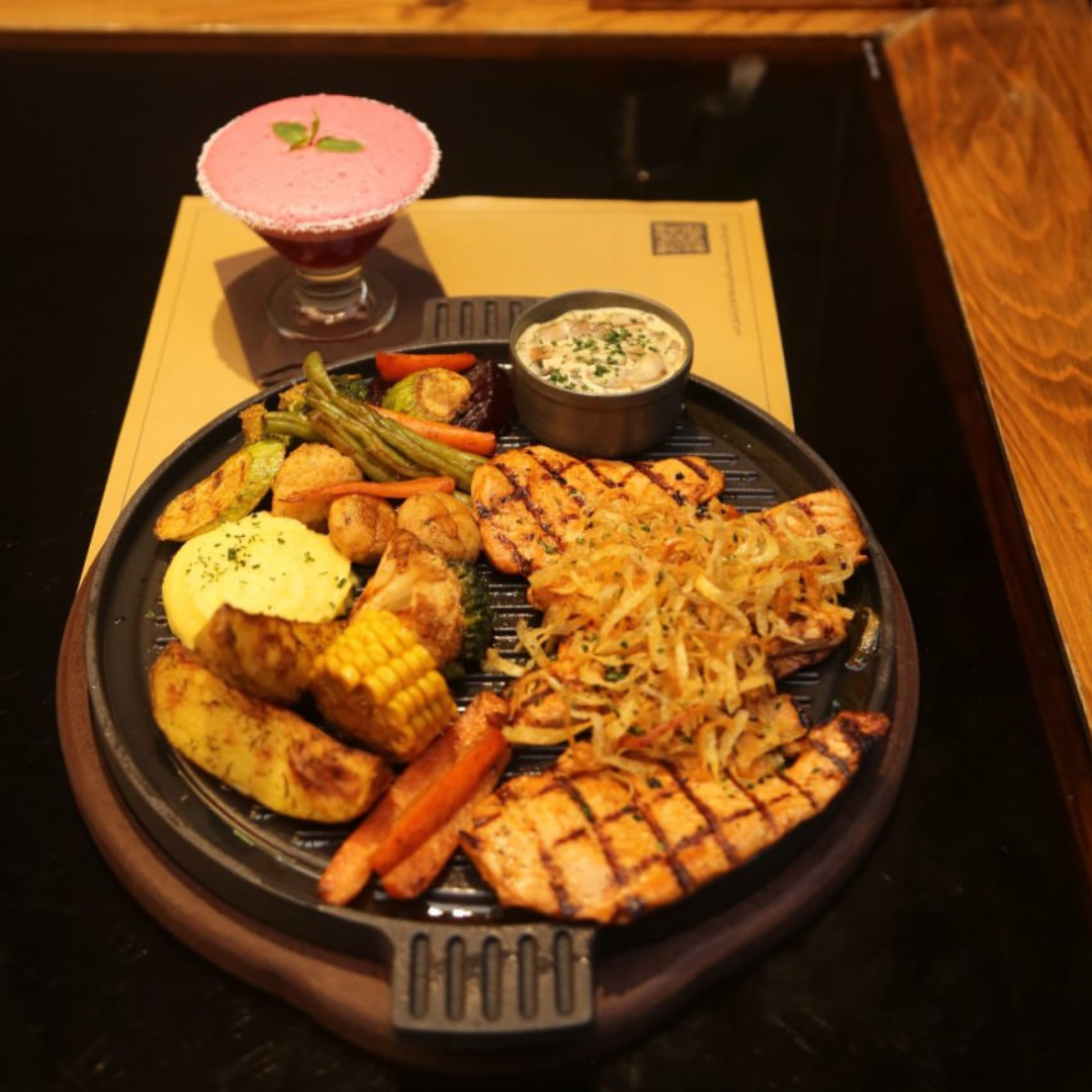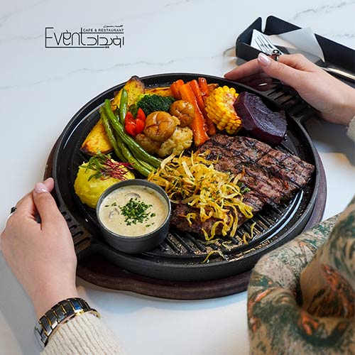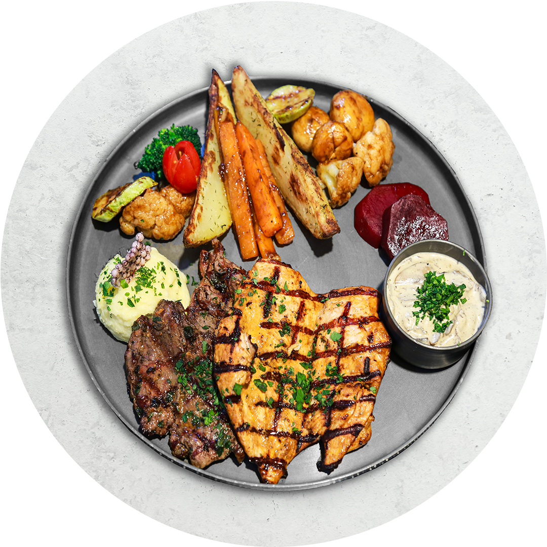 150گرم فیله گوساله، 150 گرم شینسل مرغ ،سس کرم قارچ ،دورچین سبزیجات، پوره سیب زمینی