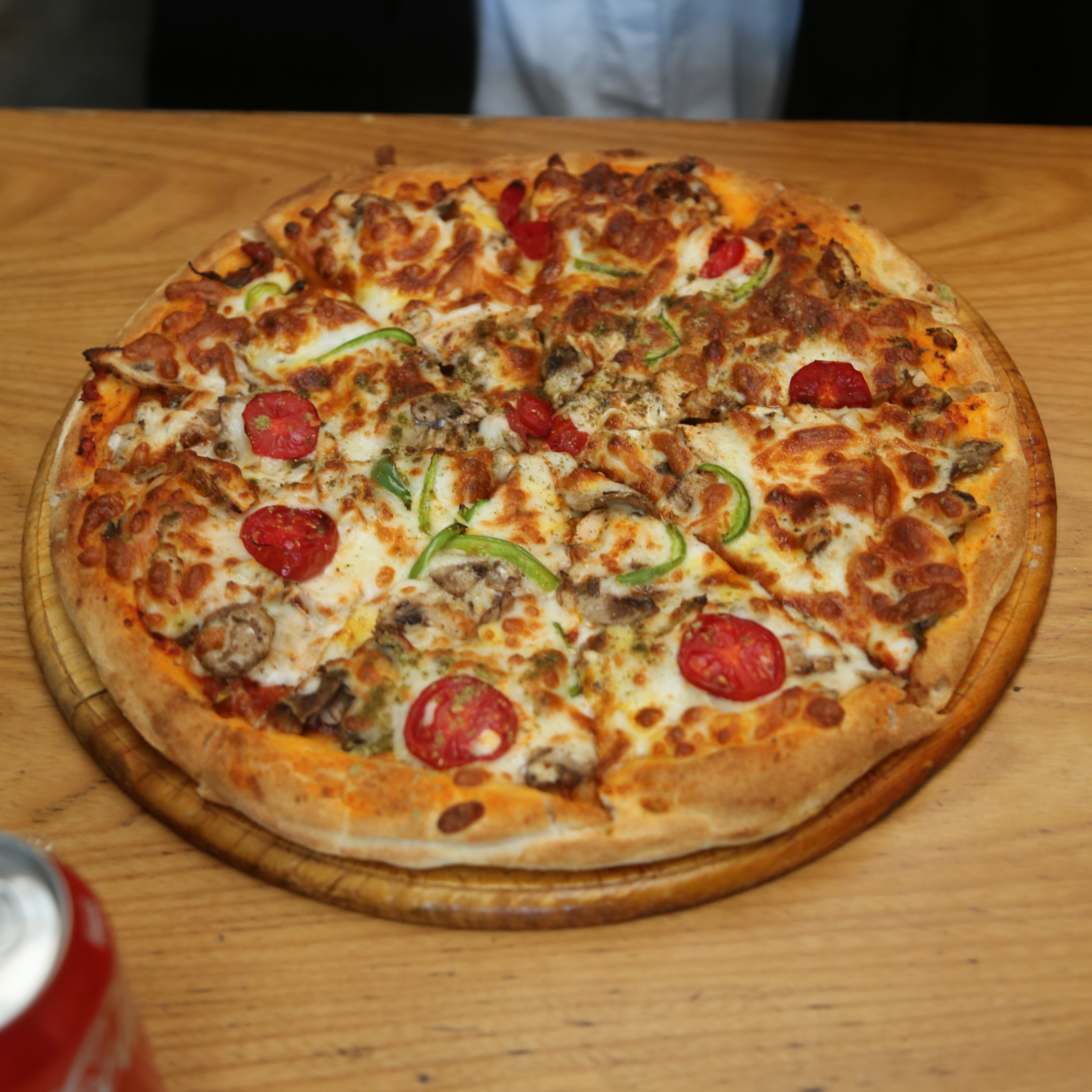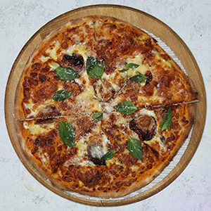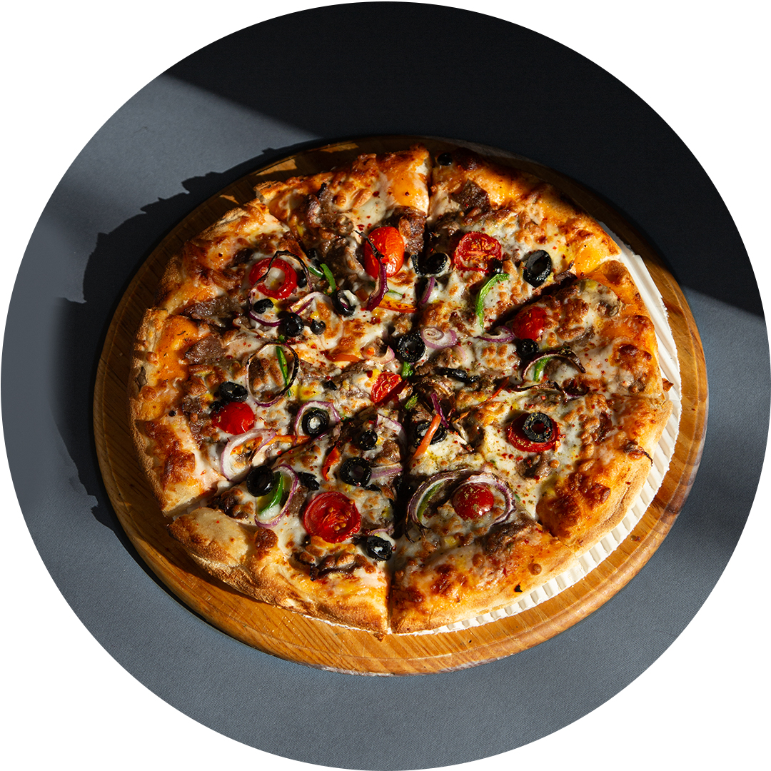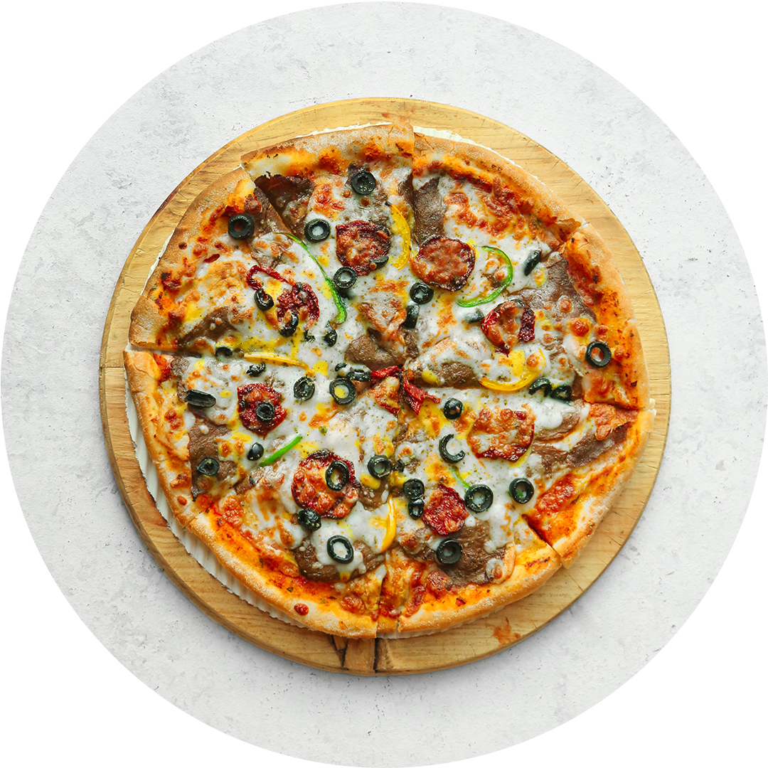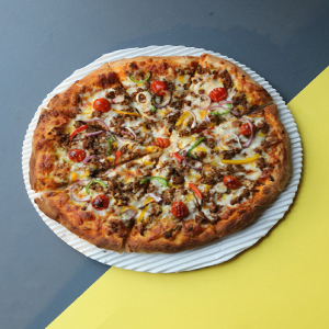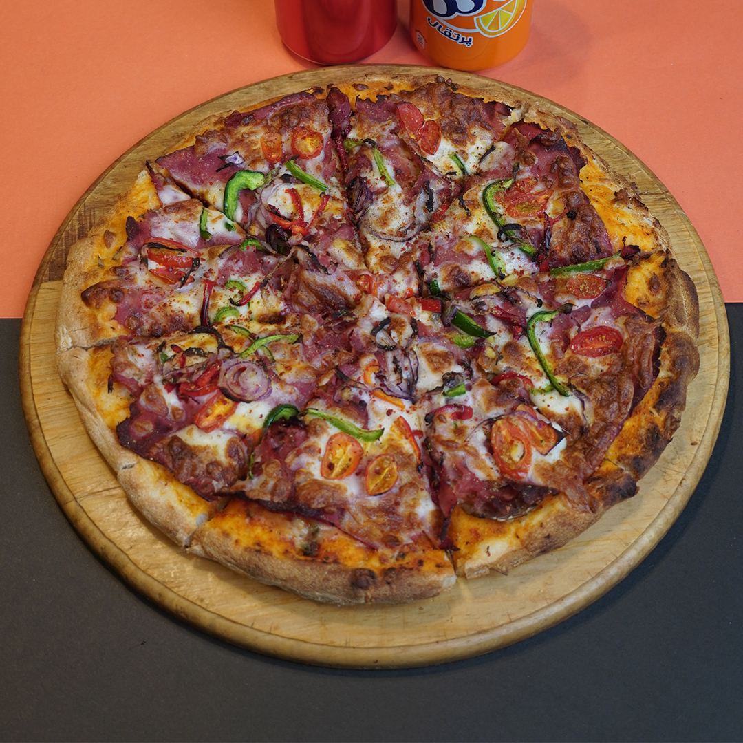 سس پومودورا،پنیرموزارلا،قارچ،قورمه گوسفندی،پیاز،فلفل دلمه،گوجه چری،زیتون سیاه