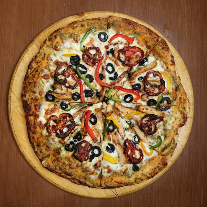 سس پستو ،پنیر موزارلا ، مرغ گریل شده،زیتون سیاه،اورگانو، پنیــر پارمسان، فلفل دلمه،گوجه خشک