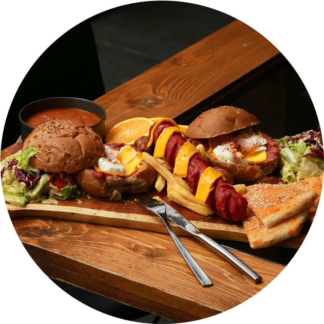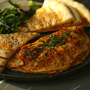 نان سیمیت ، سس کرم قارچ ، سیب زمینی خلال، یک ورق بیکن، دو عدد تخم مرغ، سالاد مخصــوص،به هـمراه یـک فنــجان چـــای