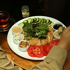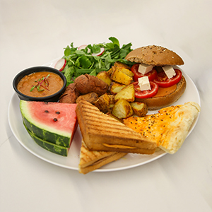 نان مخصوص،مخلوط سبزیجات،پنیر خامه ای،فلفل دلمه،دوعددتخم مرغ،دورچین سبزی،به همراه یک فنجان چای