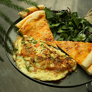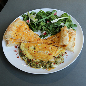 نان مخصوص،قارچ،اسفناج،پیاز،دوعددتخم مرغ،دورچین کاهو،به همراه یک فنجان چای