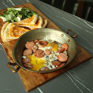 دو عدد تخم مرغ،سوسیس،دورچین سبزی،نان مخصوص،به همراه یک فنجان چای