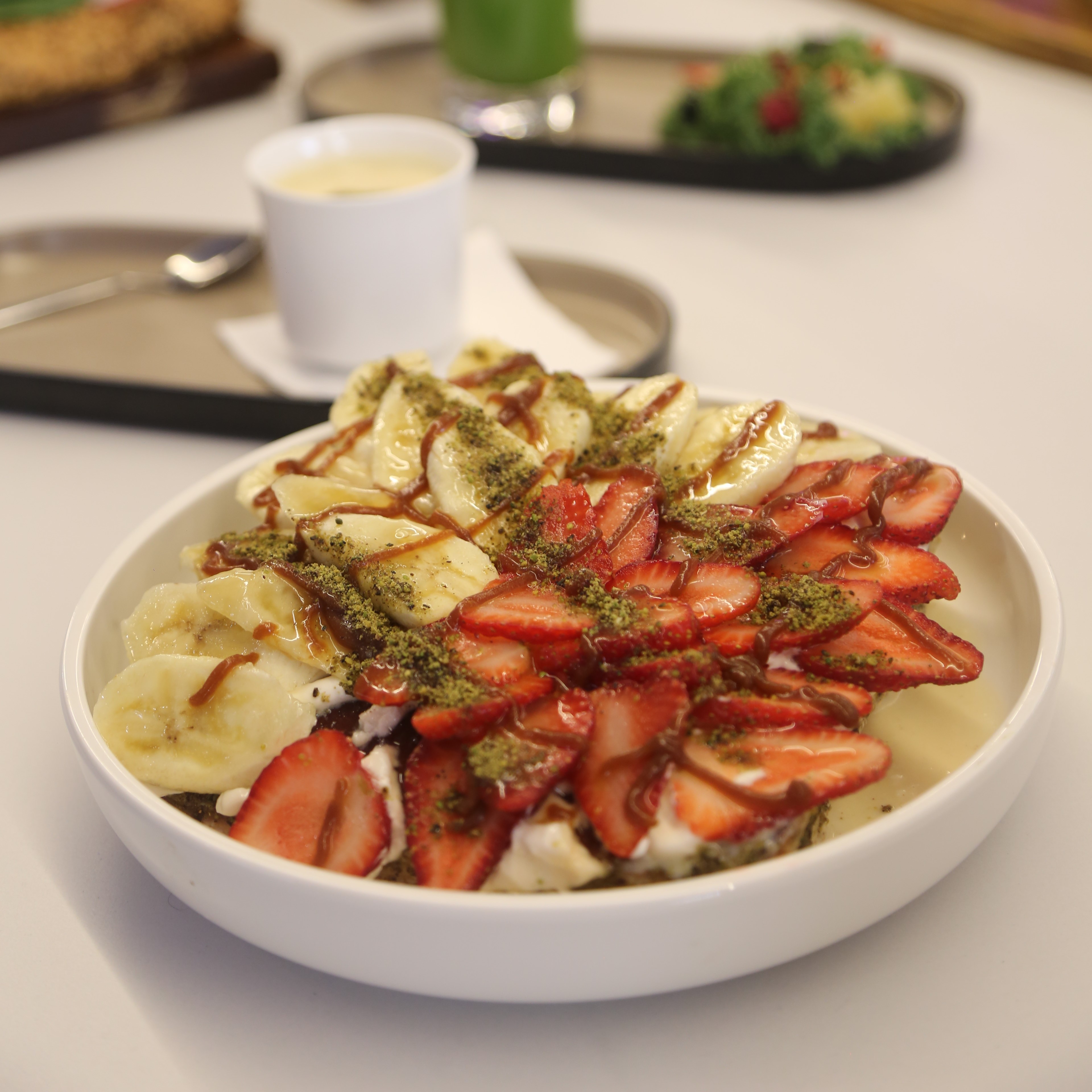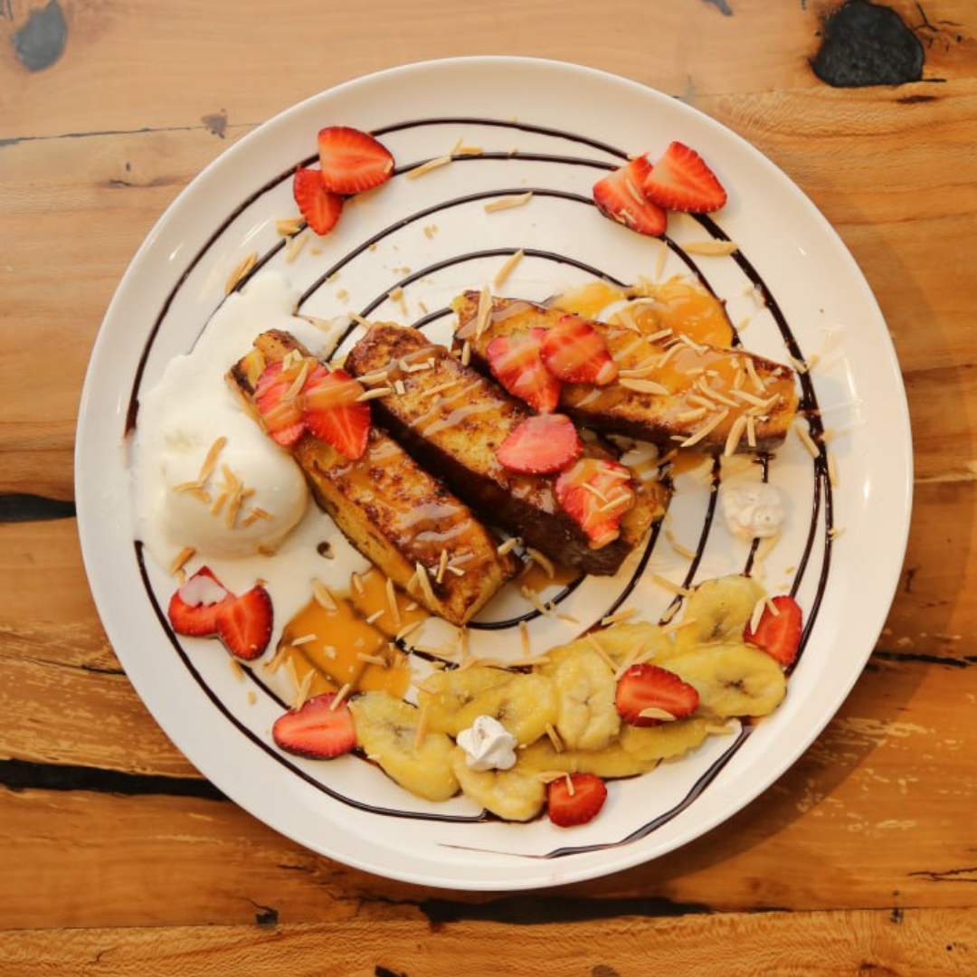 نان بریوش،موزکاراملی،یک اسکوپ بستنی،توت فرنگی،سس کارامل،به همراه یک فنجان چای