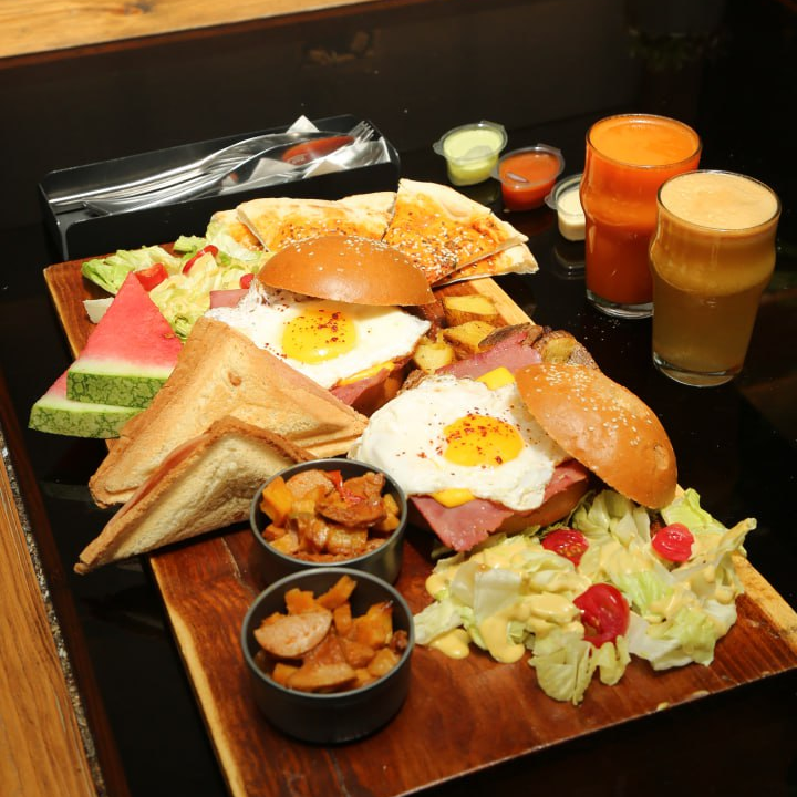 نان مخصوص،دو عدد پنینی،دو عدد نان فینگلیش مافین،دو عدد تخم مرغ نیمرو،دو ورق بیکن،دو ورق پنیر گودا،سیب زمینی تنوری، خوراک سوسیس،دورچین سالاد،به همراه دو فنجان چای
