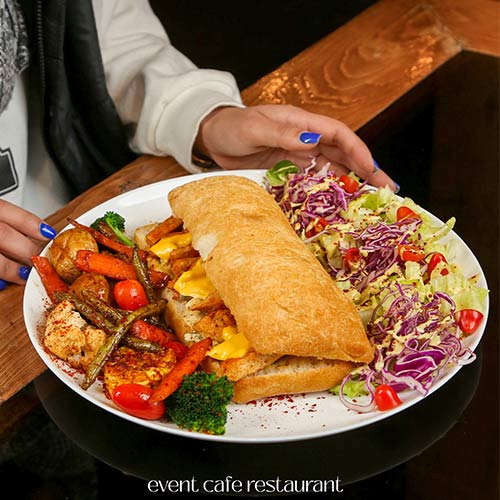 شینسل مرغ150گرم،یک ورق پنیر گودا،سس مخصوص،نان چاپاتا،دورچین کاهو و سبزیجات،یک فنجان چای