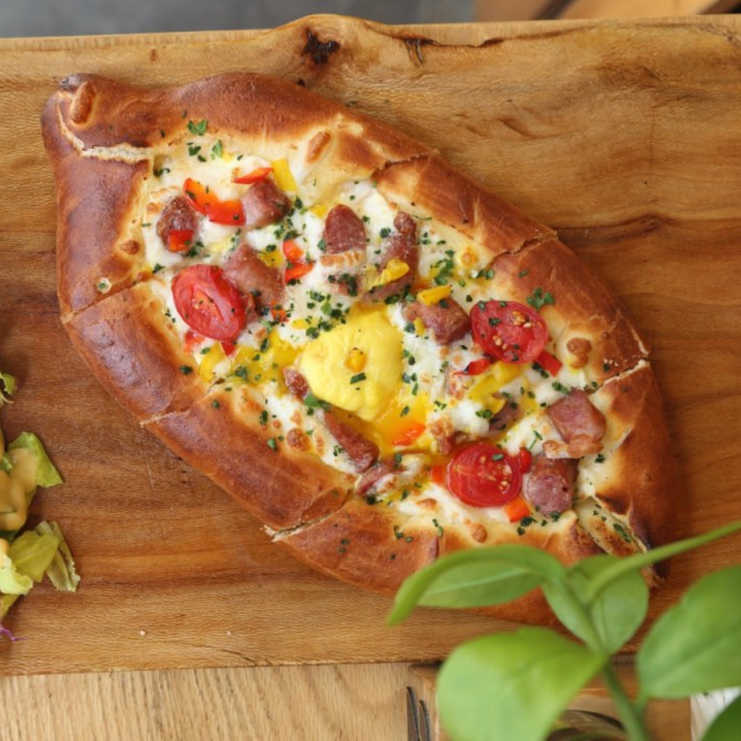 نان مخصــوص خاچاپوری، پنیر پیتزا ،یک عدد تخم مرغ، چوریزو، فلفل دلمه، جعفری، گـوجـه چری، به همراه یک فنجان چای