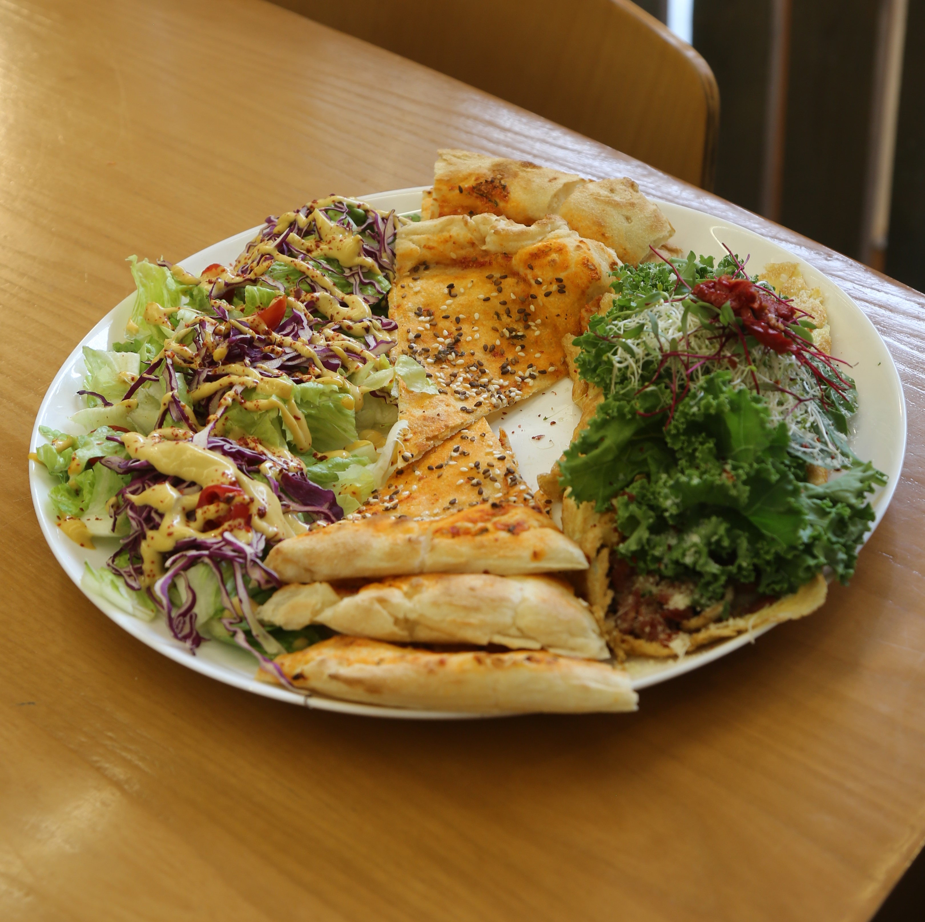 نان مخصوص،مخلوط بیکن،قارچ،فلفل دلمه،دوعددتخم مرغ،سبزیجات مدیترانه ای،جوانه،گوجه خشک،پنیرپارمسان،دورچین کاهو،یک فنجان چای