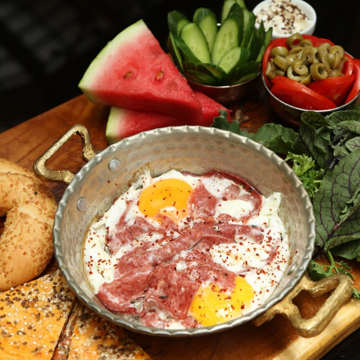 نان مخصوص،پپرونی،،دو عدد تخم مرغ نیمرو،زیتون سبز،گوجه فرنگی،خیار،نان سیمیت،پنیر،گردو،سبزیجات مدیترانه ای،سه اسلایس میوه فصل به همراه دو فنجان چای