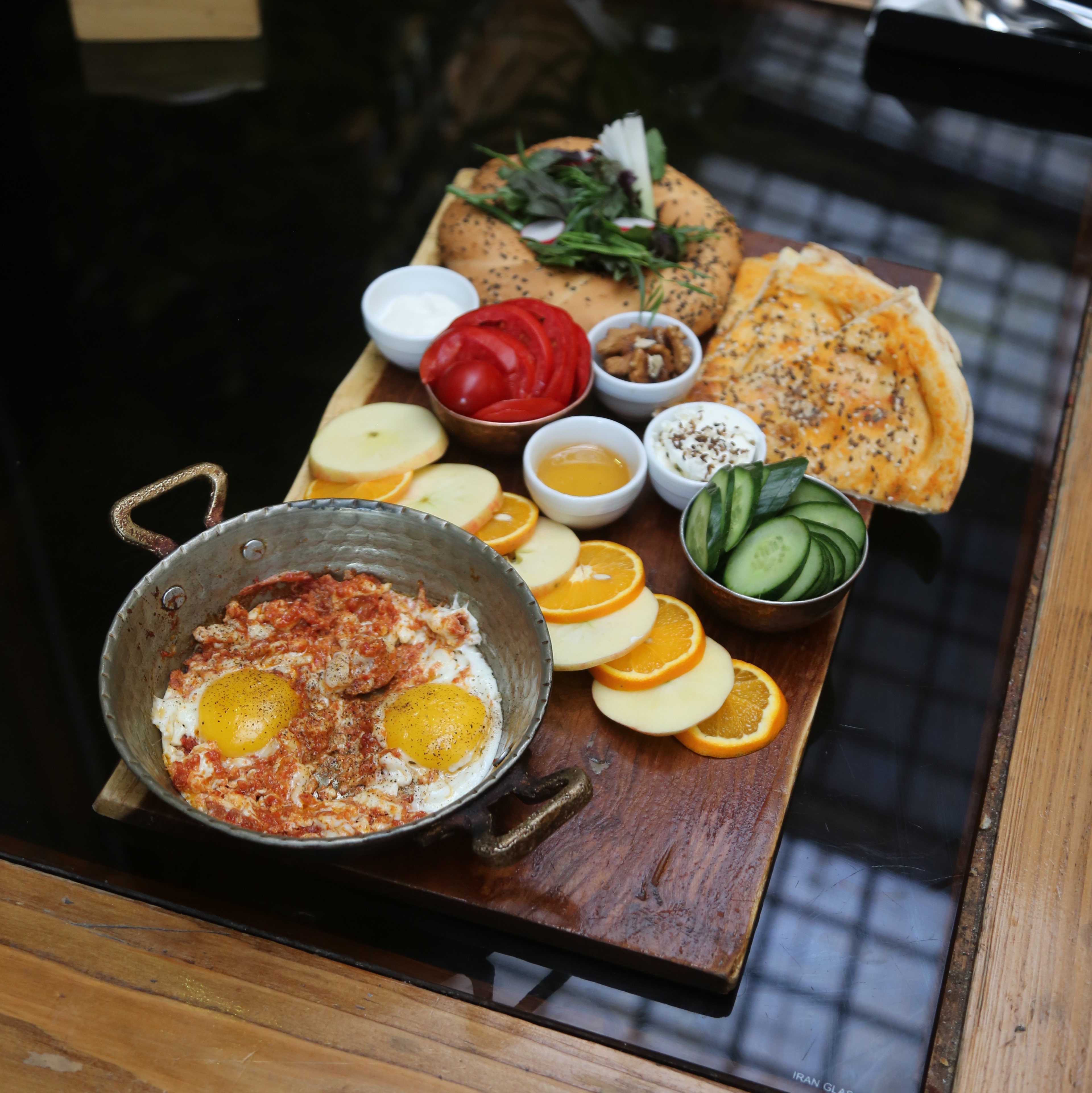 نــان مخصــوص، املت ربی شامل دو عدد تخم مرغ، خامه عسل، پنیر، گردو، خیار، گوجه فرنگی، سه اسلایس پرتقال، یک مدل میوه فصل،سبزی، به همراه دو فنــجان چای،نان سیمیت
