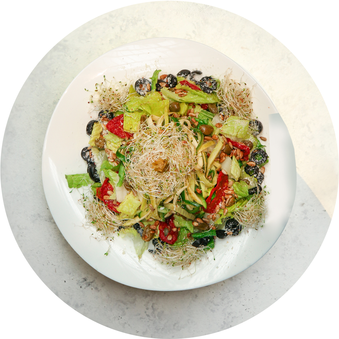 کاهو، زیتون، گوجه خشک، خیار، کدو،تخمه آفتابگردان،کاپاریس، پنیر توفو ،سس مخصوص، جوانه