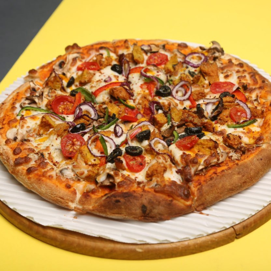 سوسیس و کالباس وگان، سس پومودورا، قارچ، فلفلدلمه،پیاز،زیتون،وگ چیز