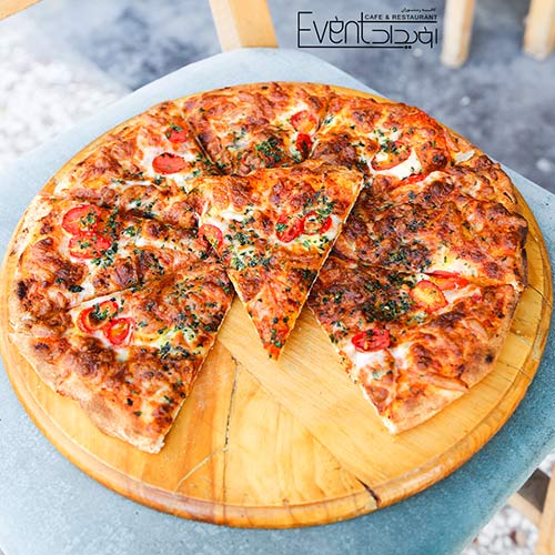 فیله جوجه مامسان، قارچ، فلفل دلمه، وگ چیز، سس مخصوص، گوجه چری، پیاز، زیتون،